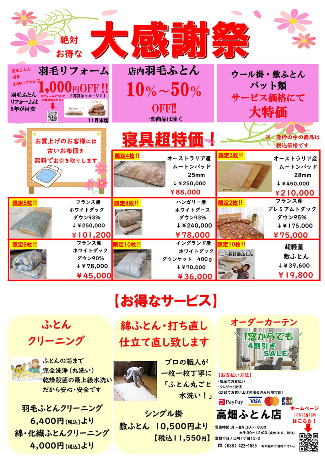 当店は倉敷市日の出町にて、祖父八郎から私で3代目の寝具製造販売の専門店として、身体に優しいこだわり素材で作られた寝具をご提供しております。
